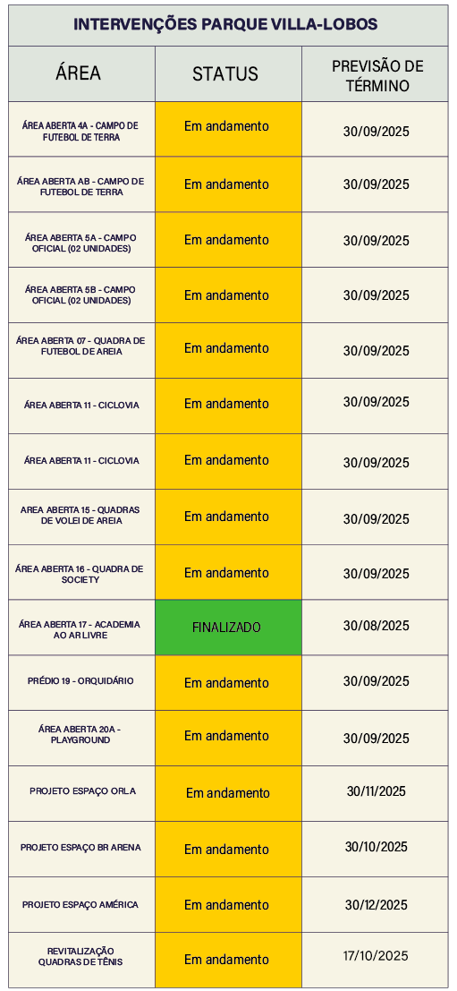 As intervenções no Parque Villa-Lobos e no Parque Cândido Portinari são essenciais para garantir que esses espaços continuem cumprindo seu papel como áreas de lazer, cultura e contato com a natureza. Elas permitem a modernização da infraestrutura e a melhoria da experiência dos visitantes. Além disso, asseguram que os parques permaneçam acessíveis, seguros e acolhedores, fortalecendo seu papel como patrimônio coletivo da cidade.